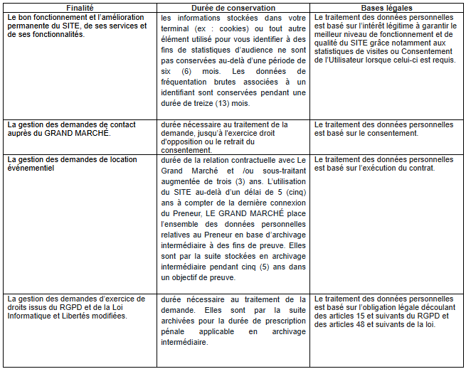 L’utilisation du Site par les Utilisateurs pourra entraîner la communication de données personnelles. Le traitement des données par le Grand Marché, en sa qualité de Responsable du traitement, ou par les prestataires agissant au nom et pour le compte du Grand Marché, sera conforme à la Loi et au Règlement.
